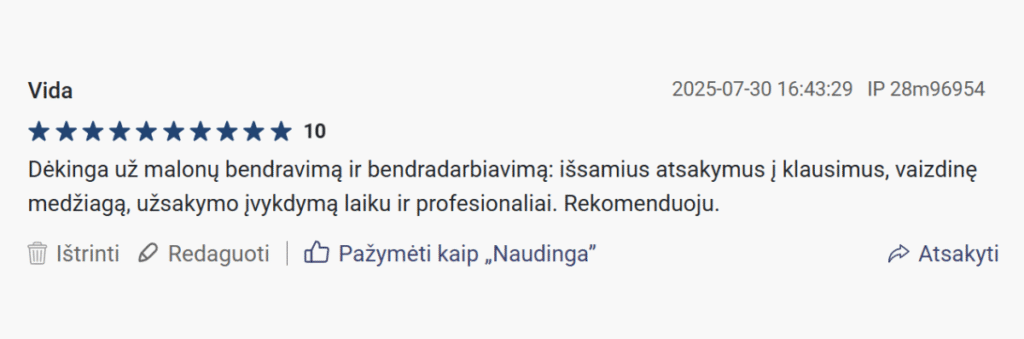„Dėkinga už malonų bendravimą ir bendradarbiavimą: išsamius atsakymus į klausimus, vaizdinę medžiagą, užsakymo įvykdymą laiku ir profesionaliai. Rekomenduoju.“