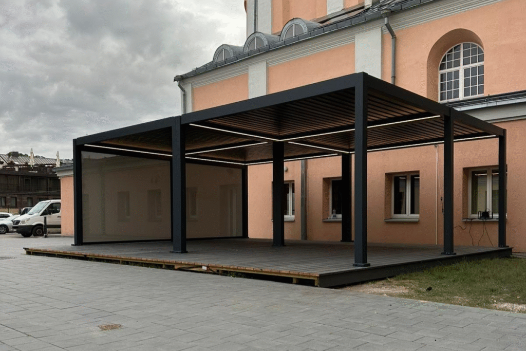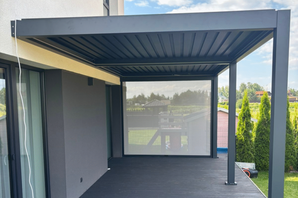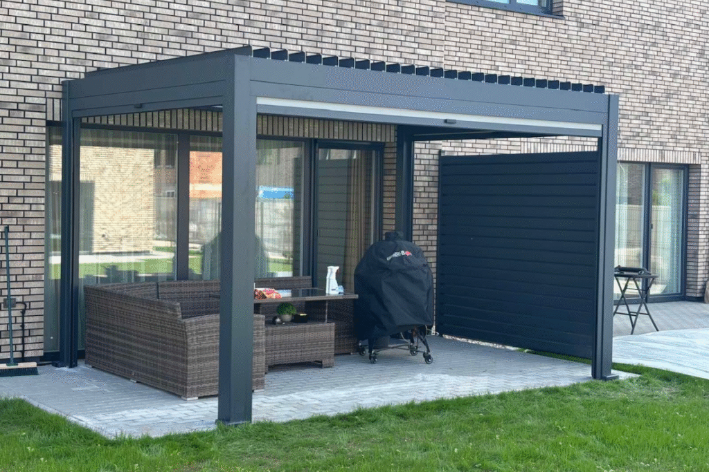 „Statėm pergolą su stiklinėmis sienelėmis, montavom prie namo sienos. Labai patogu – išeini tiesiai iš namų į uždarą, jaukią erdvę.“