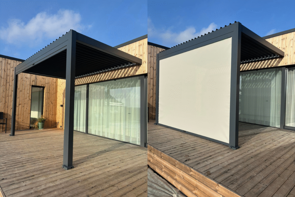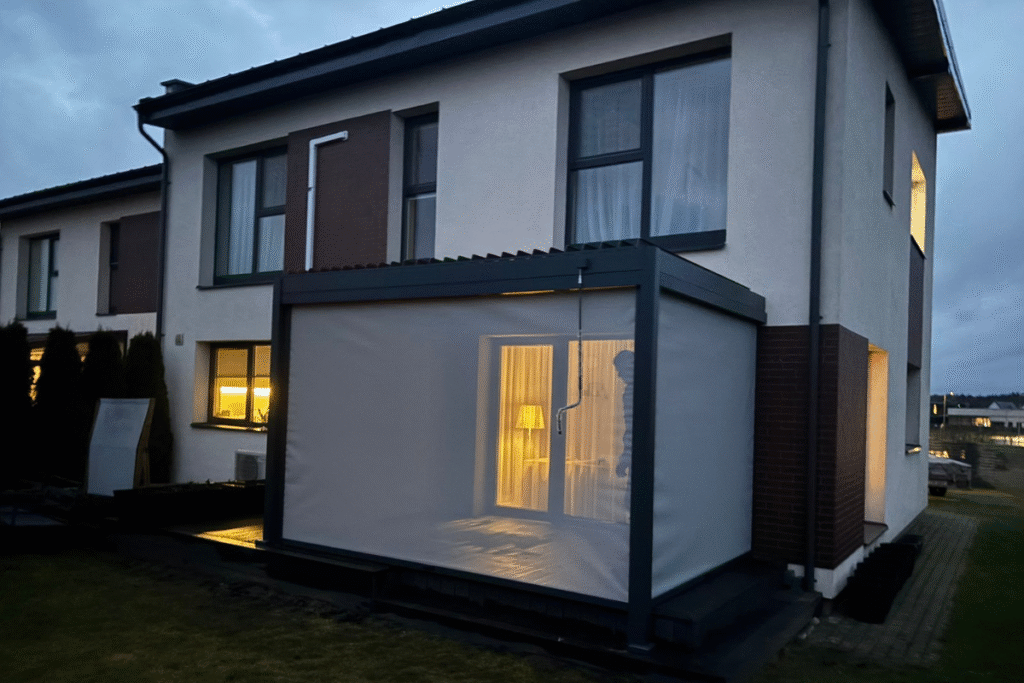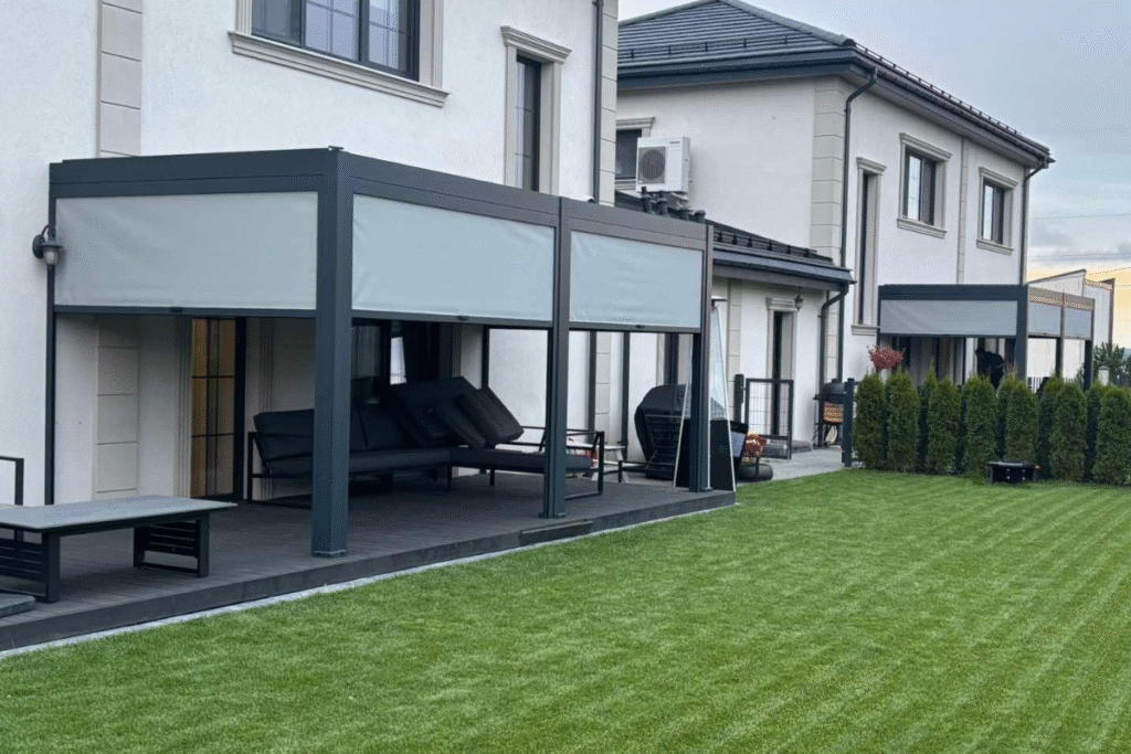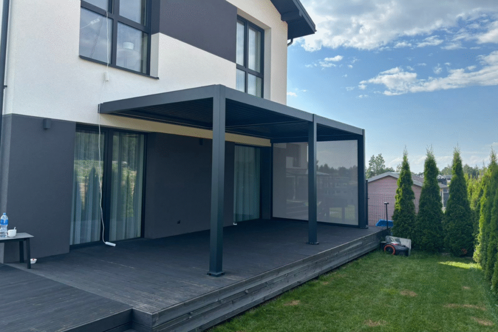 Ta pati pergola iš kito kampo – atvira, stilingai integruota į terasą su minkštais baldais ir stumdomais stiklais.