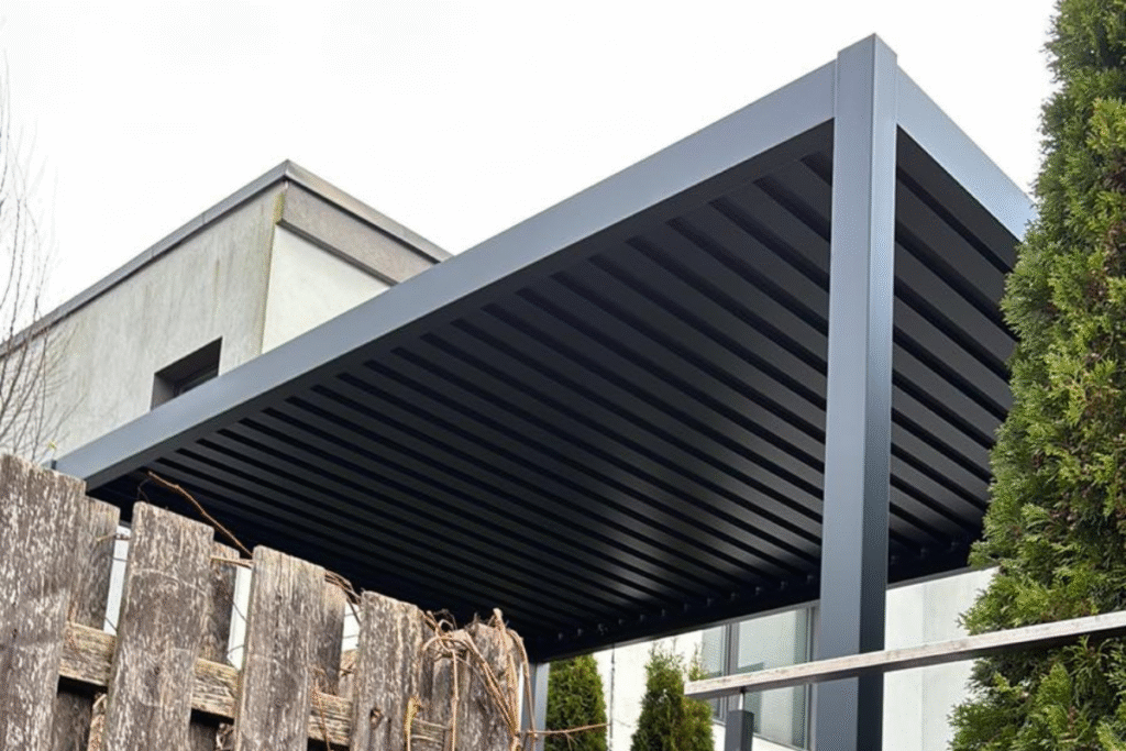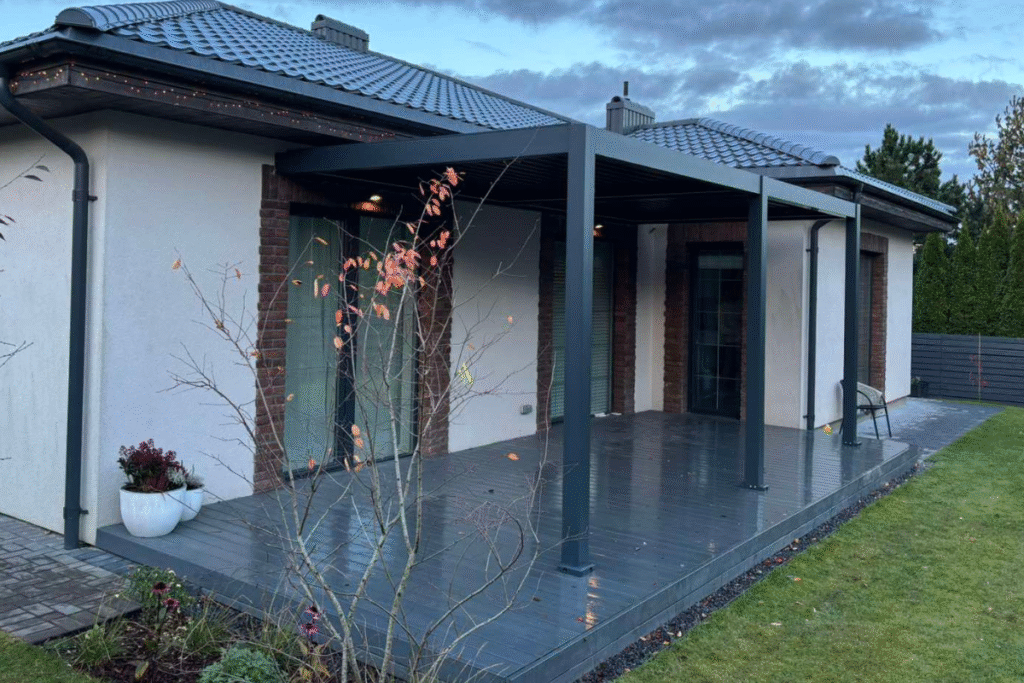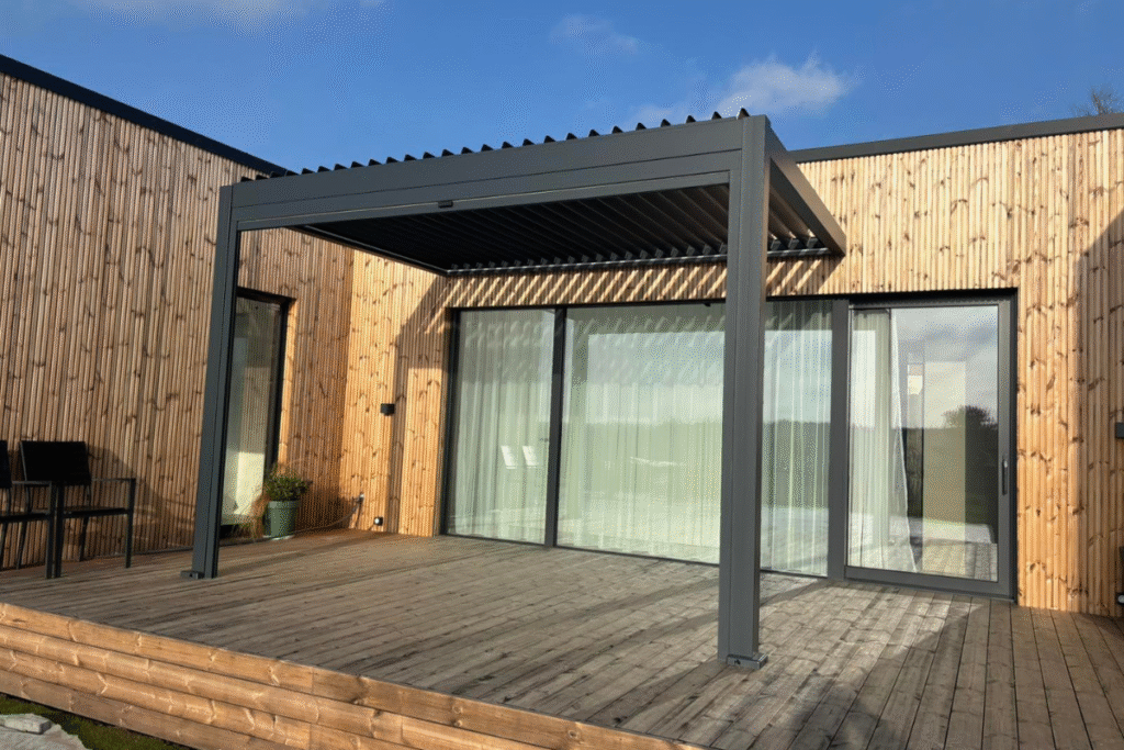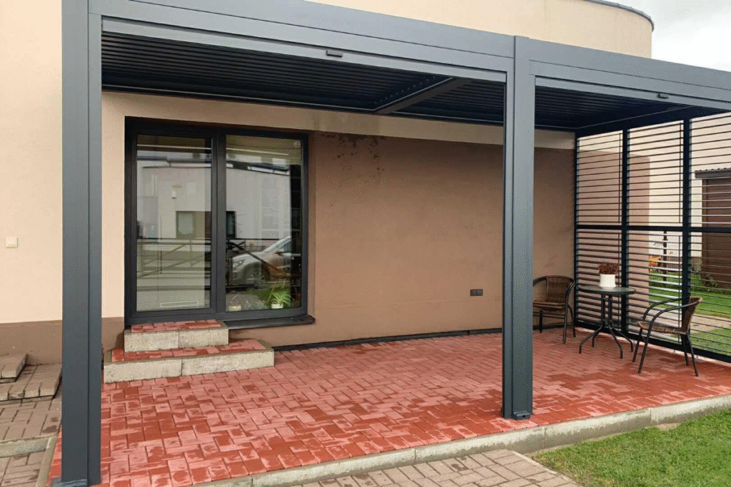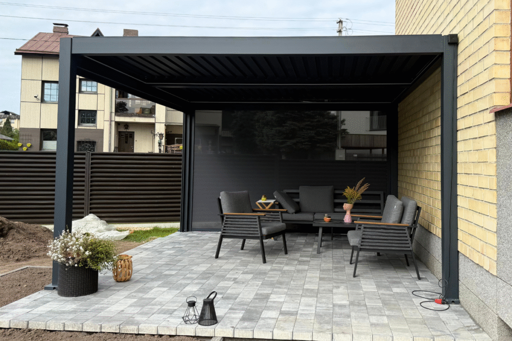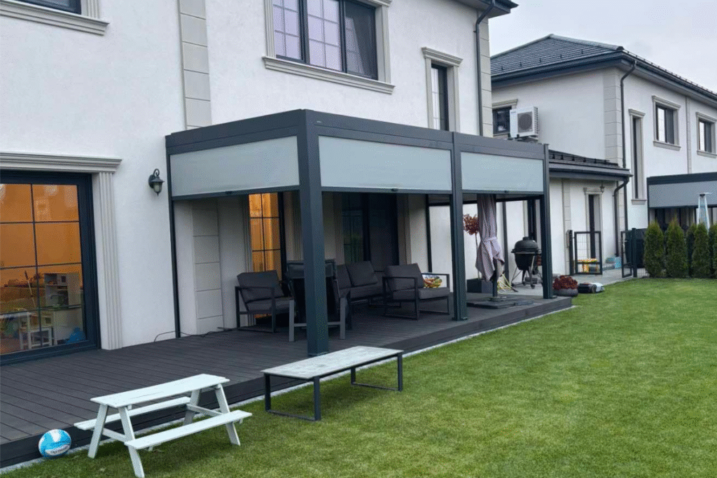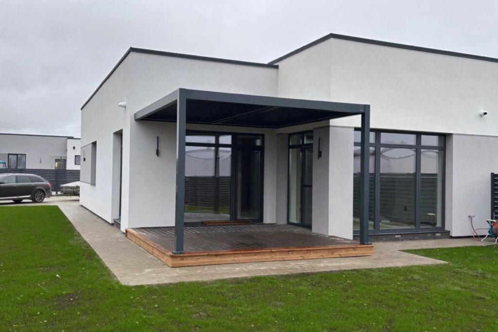 C7 Elite pergola su pakreipiamomis lamelėmis ir lauko baldais, įrengta prie šviesaus, modernios architektūros namo.