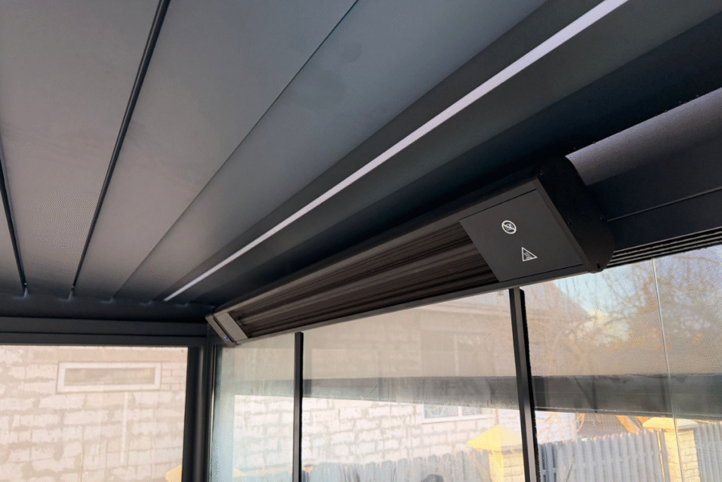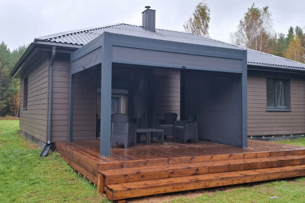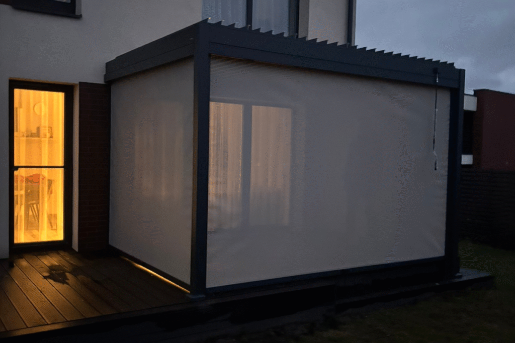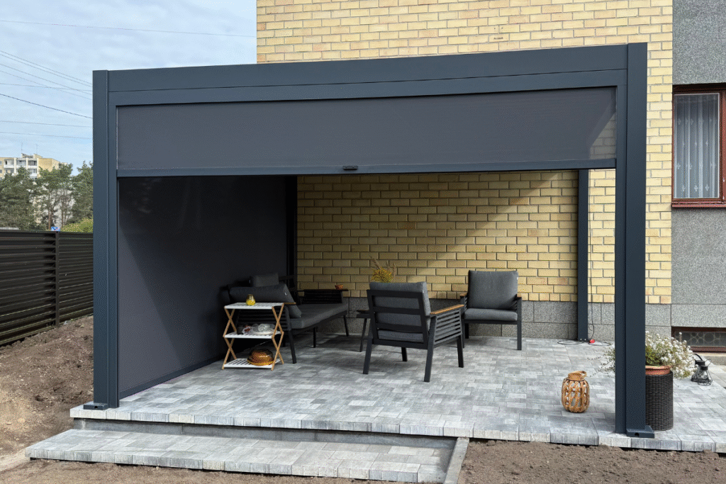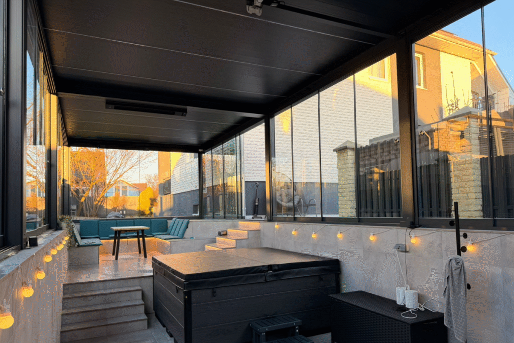 Stiklinėmis sienelėmis uždara pergola su tamsiu stogu ir integruotu apšvietimu, įrengta su lauko baldais ir apdaila.