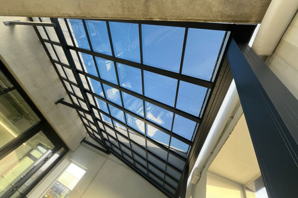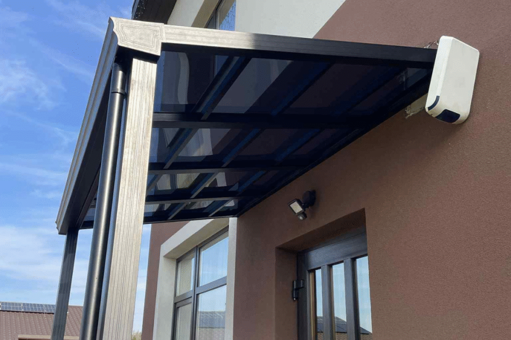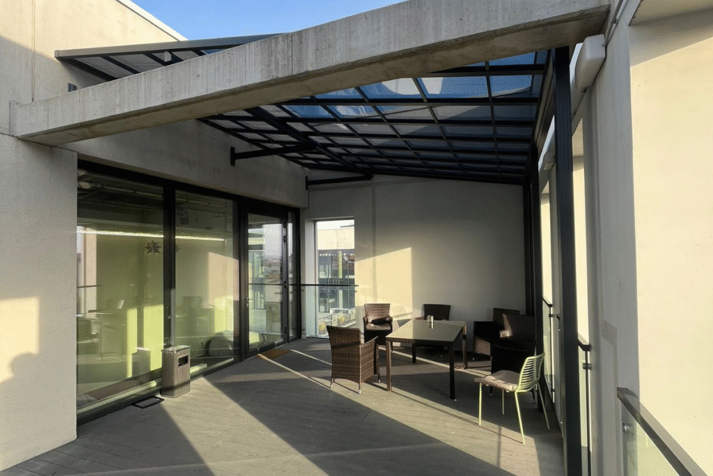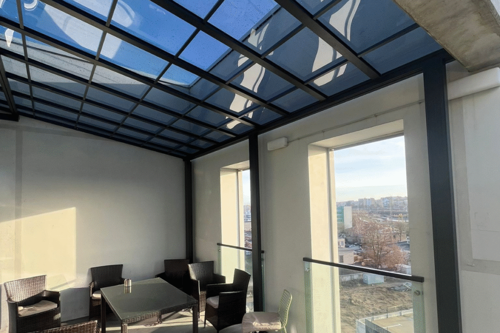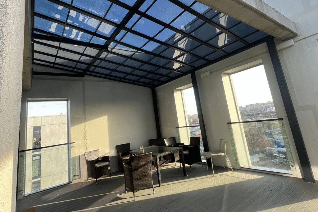 Stiklinėmis sienelėmis uždara pergola su tamsiu stogu ir integruotu apšvietimu, įrengta su lauko baldais ir apdaila.