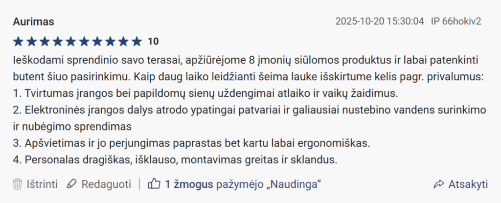 „Atlaikė ir žiemą ir vasarą, rekomenduoju! Didžiulis ačiū Nordin už kokybišką daiktą.“