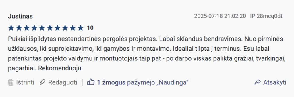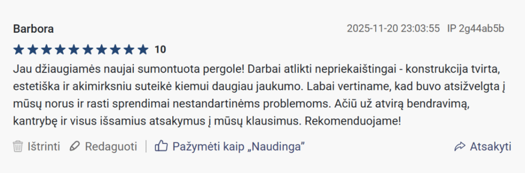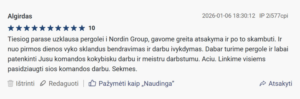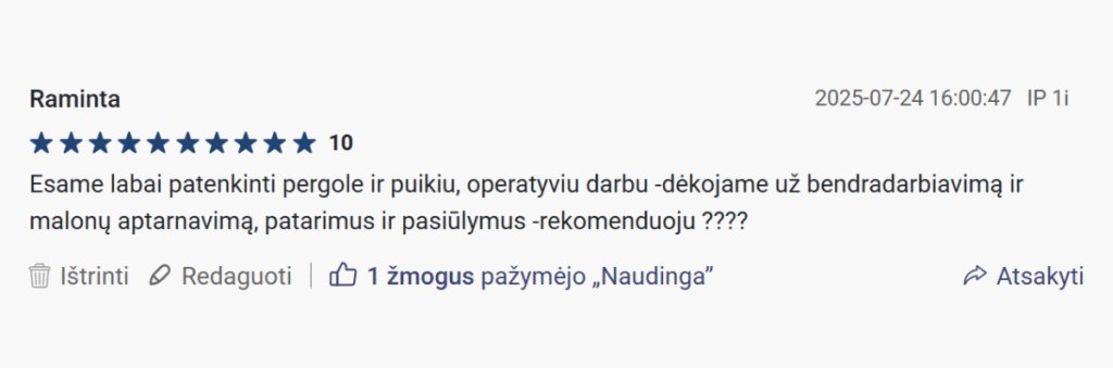 „Atvyko laiku, viską surinkome pagal instrukciją – jokių rūpesčių! Nebeįsivaizduojame vakarų kieme, be pergolos.“