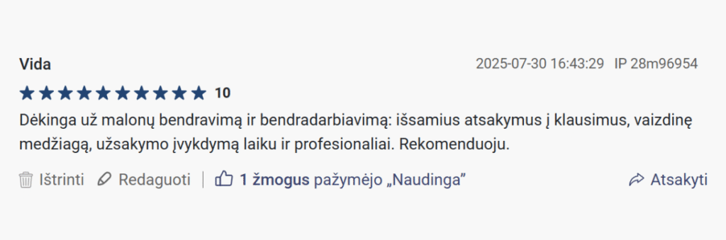„Rekomenduoju įmonę kaip kompetentingą ir profesionalumu grįstą, abejojome ar tikrai mus supras iš kelių žodžių, tačiau įvykdė su kaupu. Produkto kokybė lenkia mūsų lūkesčius.“