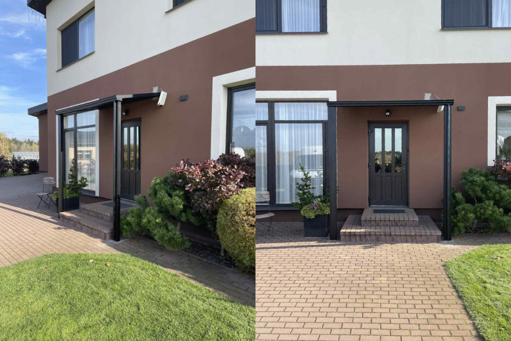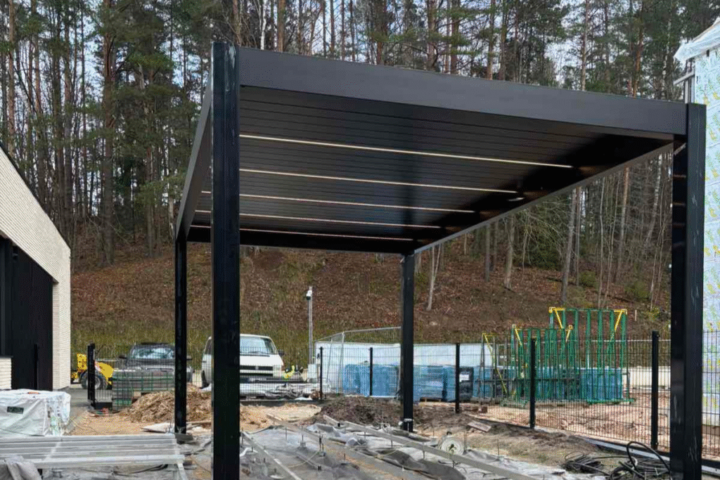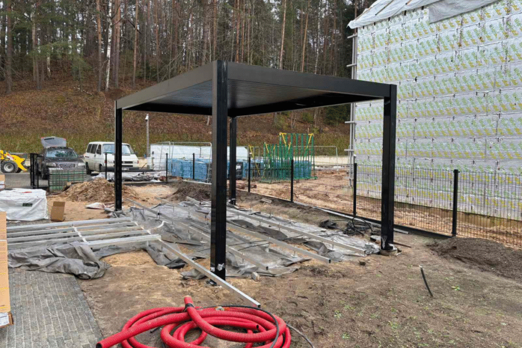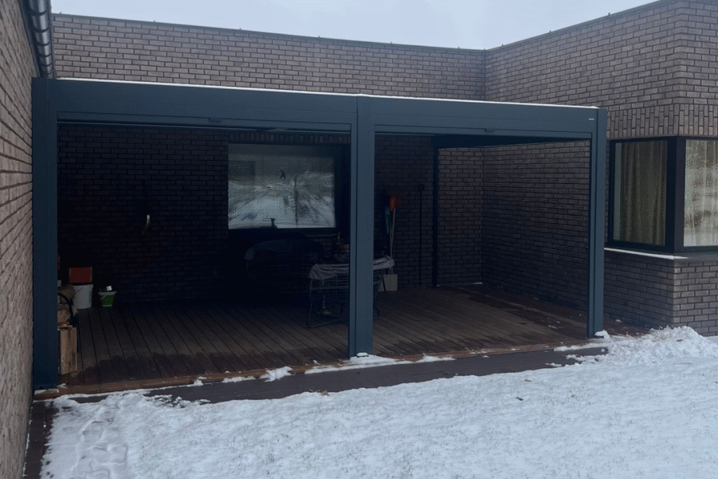 C4S 4x4 pergola su apšvietimu, pritvirtinta prie raudonų plytų namo, su atviru stogu ir terasa.