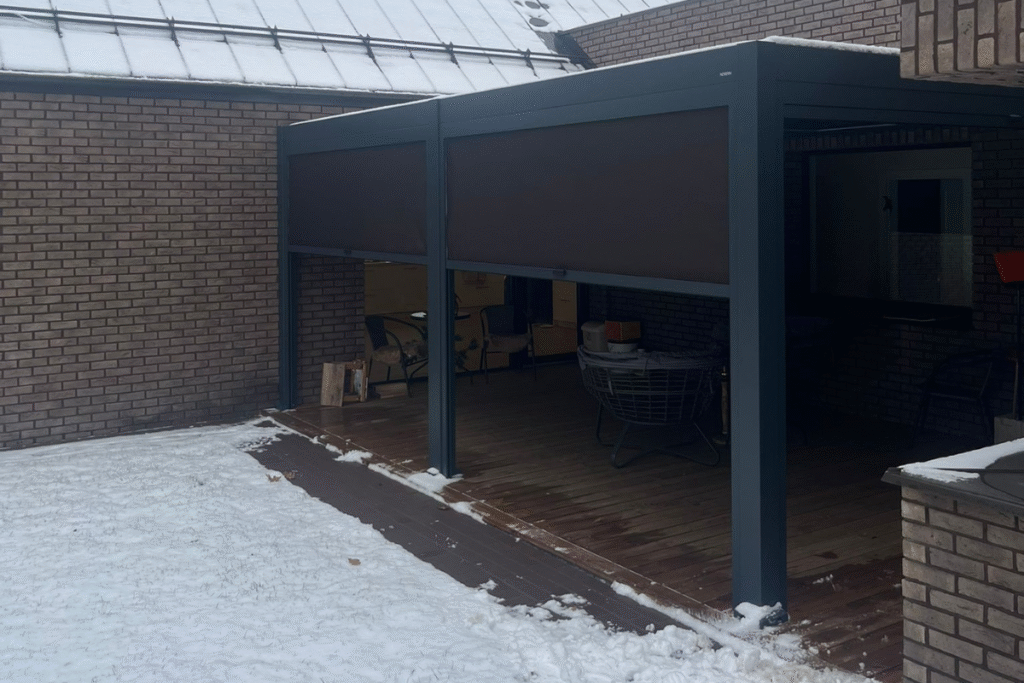 Ta pati pergola žiemos metu su nuleistomis šoninėmis užuolaidomis, apsaugančiomis nuo oro sąlygų.